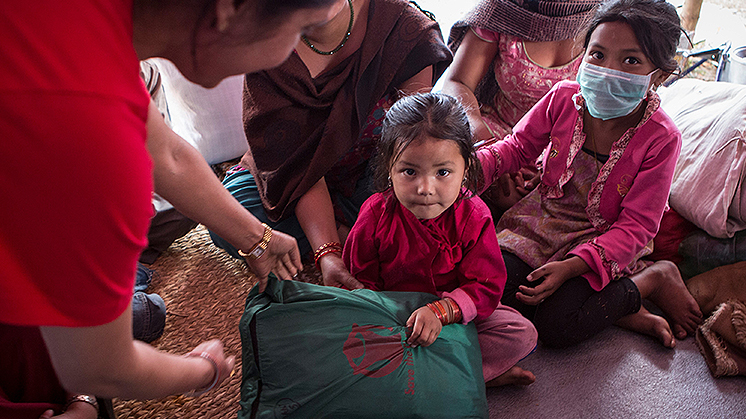 Aswini, four, at a tented settlement in Kamalbinayak, Bhaktapur, Nepal. Save the Children is providing displaced families essential items with infant kits, which include warm clothes, hats and blankets as well as essential hygiene kits.